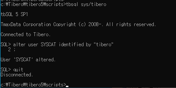 alter user SYSCAT identified by "tibero" 라고 해서 비밀번호 변경을 해줬다.