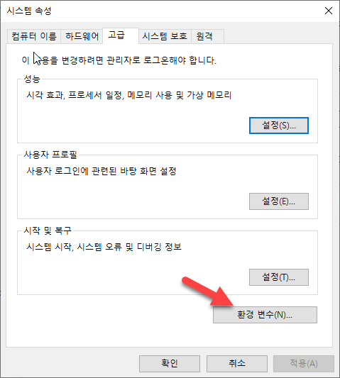 고급 > 환경변수로 들어간다.