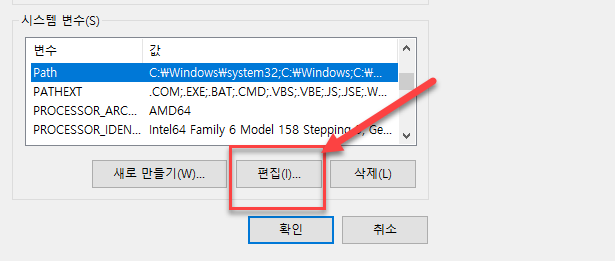 시스템 변수 > Path 를 선택하고 편집을 클릭하여 창을 열여준다.