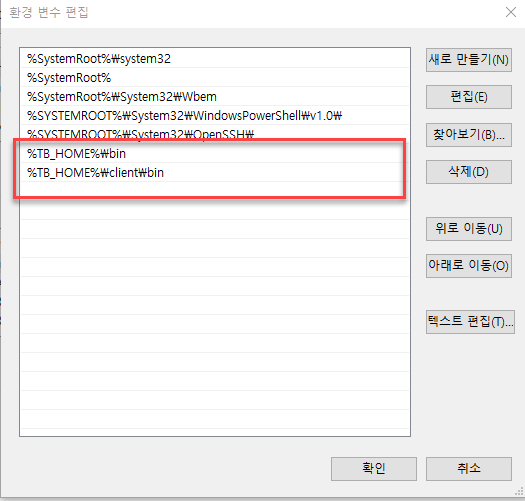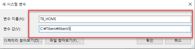 PATH : Tibero 경로 등록 %TB_HOME%\bin 과 %TB_HOME%\client\bin