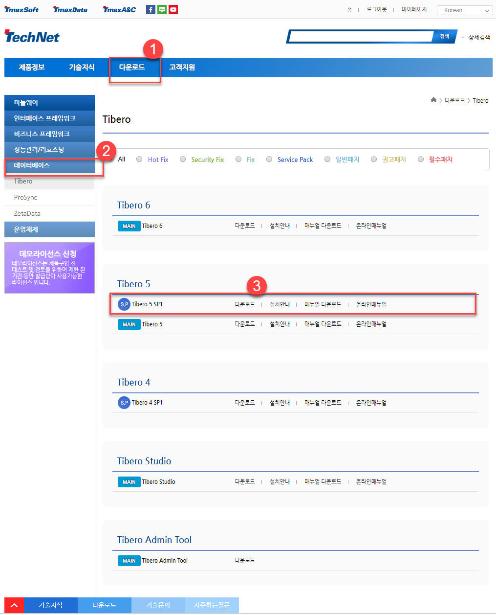 로그인 해서 다운로드 > 데이타베이스 > Tibero 5로 이동한다.