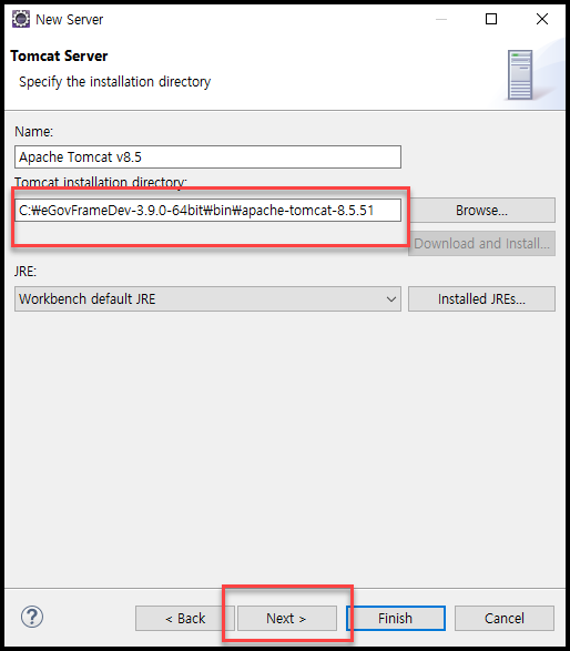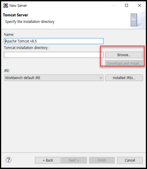 - Browse... 을 선택하여 이전에 옮겨둔 톰캣의 경로를 지정해준다.