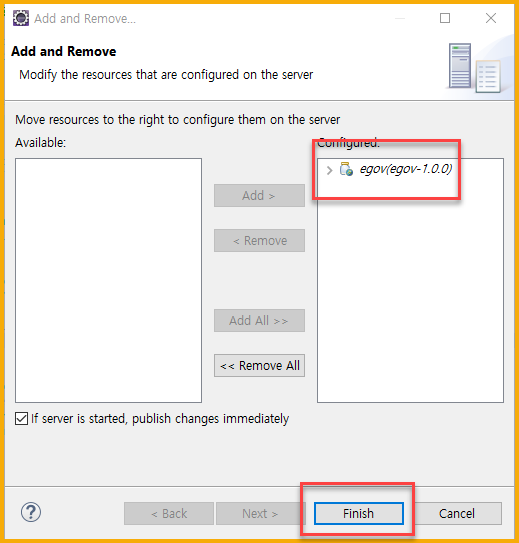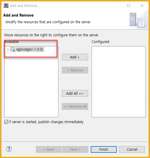 - 왼쪽 프로젝트를 선택해서 Add > 를 클릭하여 설치하는 톰캣에서 프로젝트가 돌아갈 수 있도록 한다.