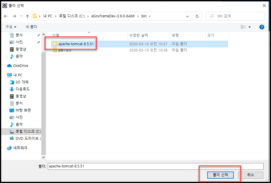 - C:\eGovFrameDev-3.9.0-64bit\bin\apache-tomcat-8.5.51 가 된다.