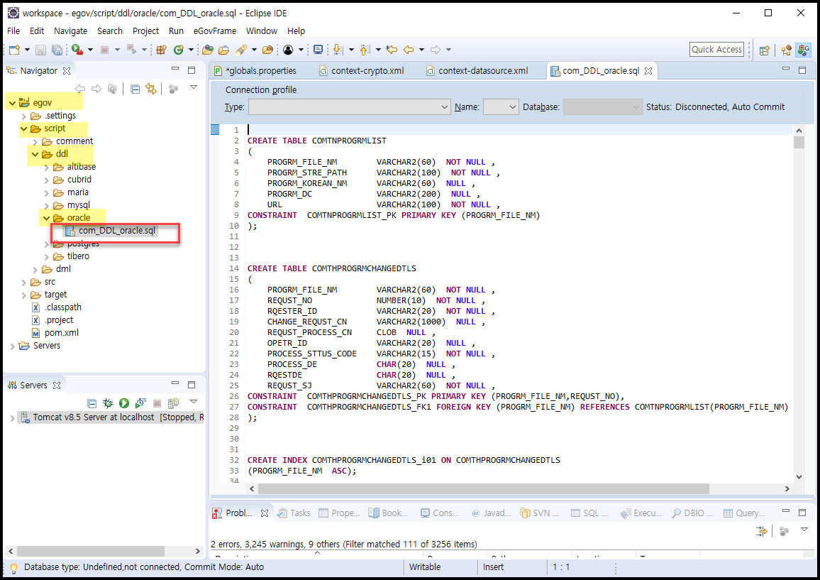프로젝트(egov) > script > ddl > oracle > com_DDL_oracle.sql 파일을 더블클릭해서 열어본다.