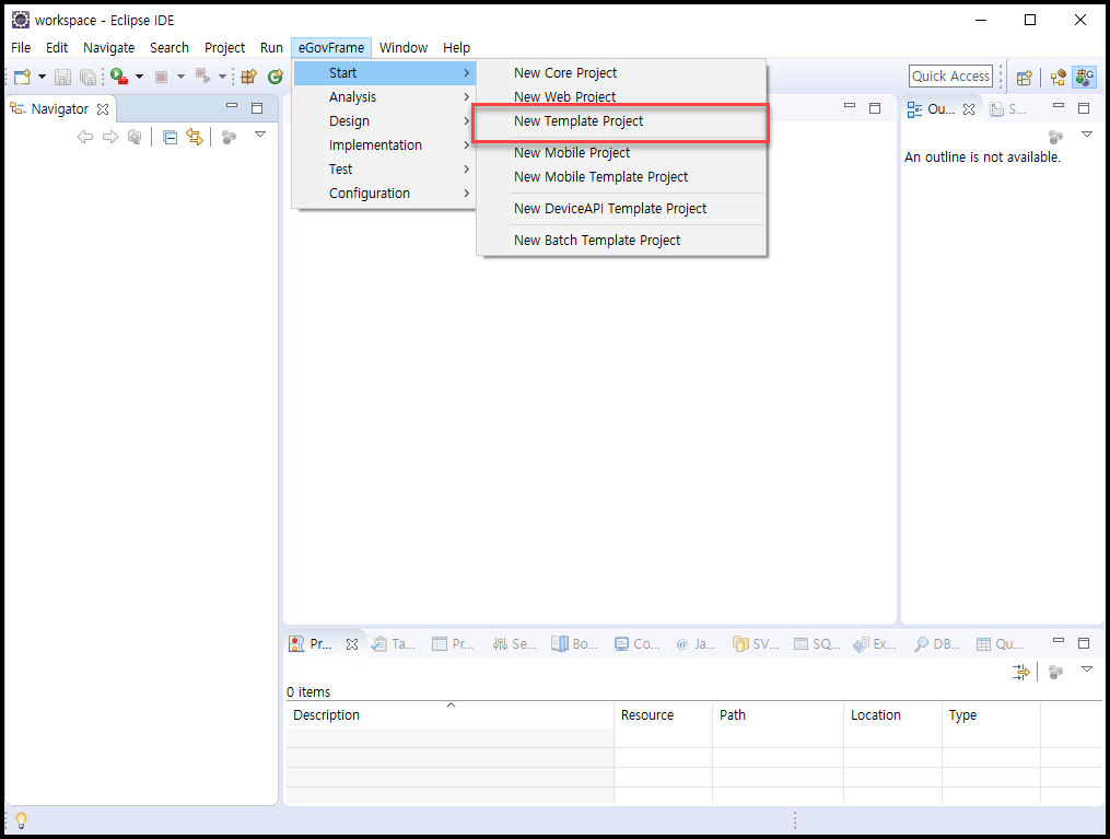 - 메뉴 > egovFrame > Start > New Template Project