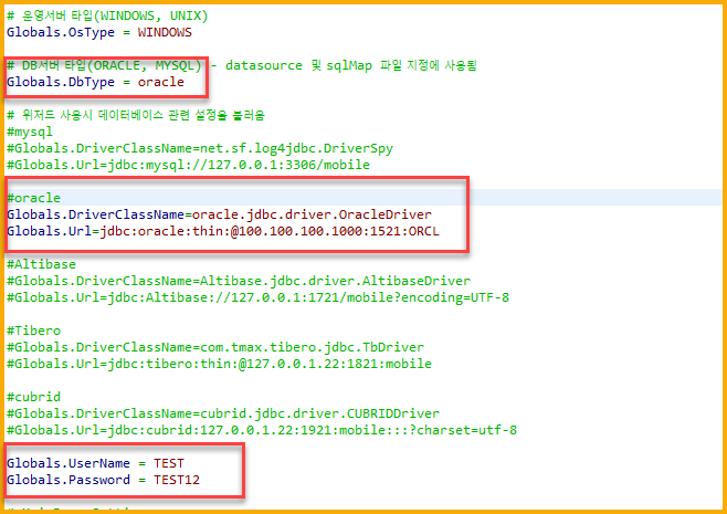 Globals.DbType = mysql 을 Globals.DbType = oracle로 변경한다. 꼭 소문자이어야만 한다.