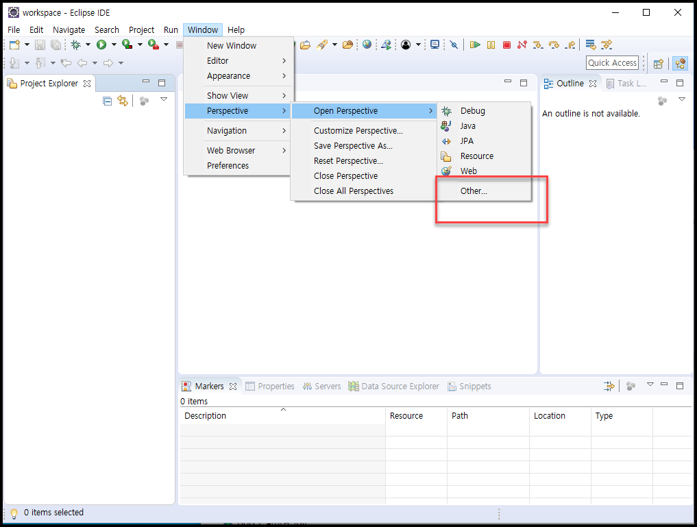 - Window > Perspective > Open Perpective > Other 선택