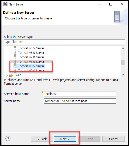 - Apache 밑에 있는 Tomcat v8.5 Server 를 선택한다.