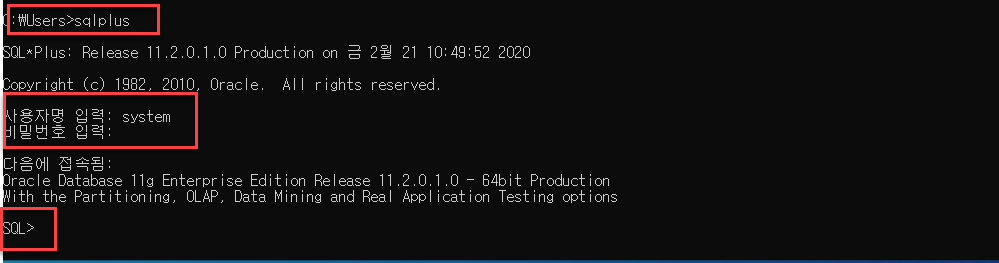 사용자명, 비밀번호에 system과 설치하면서 설정한 비밀번호를 입력한다.