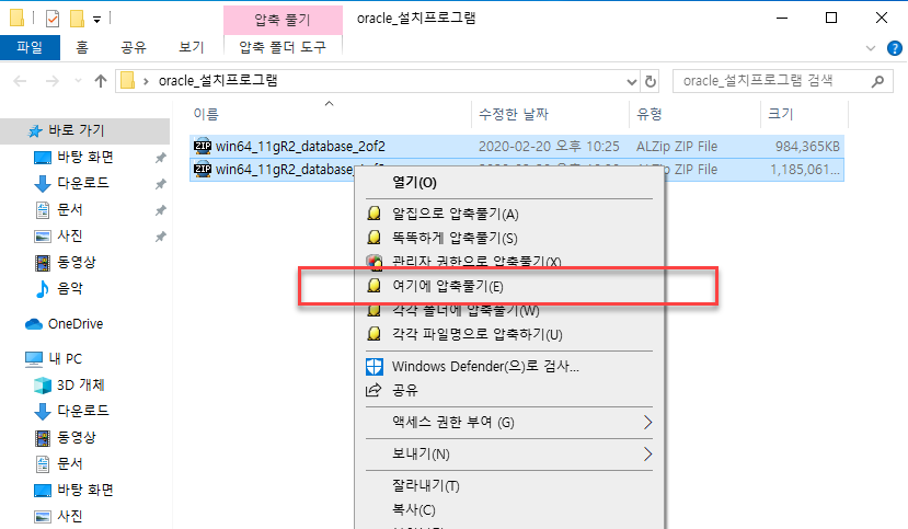 알집으로 압축을 푸는데. 2개의 파일을 모두 선택한 후에 여기에 압축풀기를 한다.