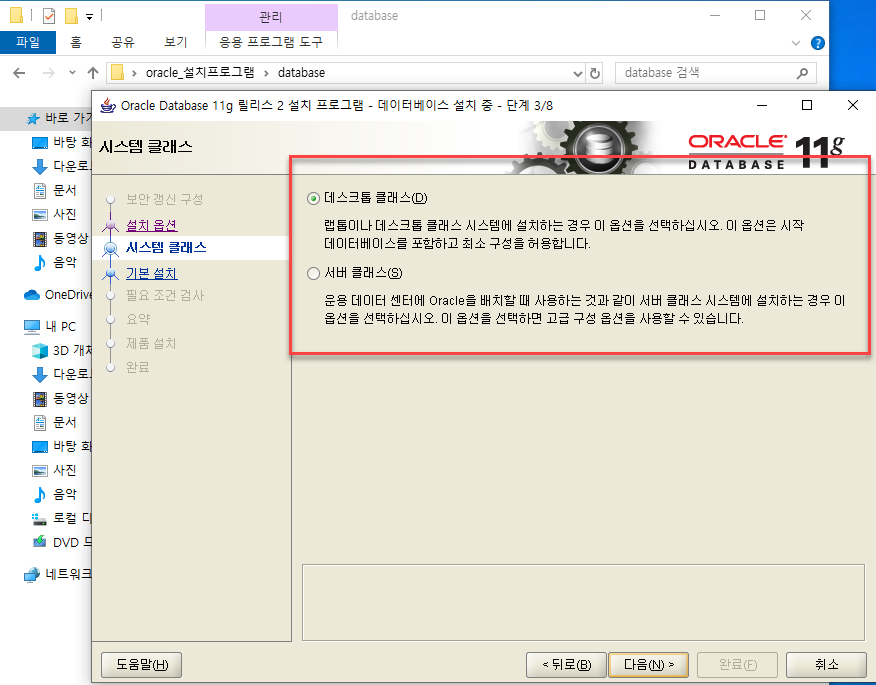 데스크톱 클래스, 서버 클래스 중 선택하여 설치를 진행한다.