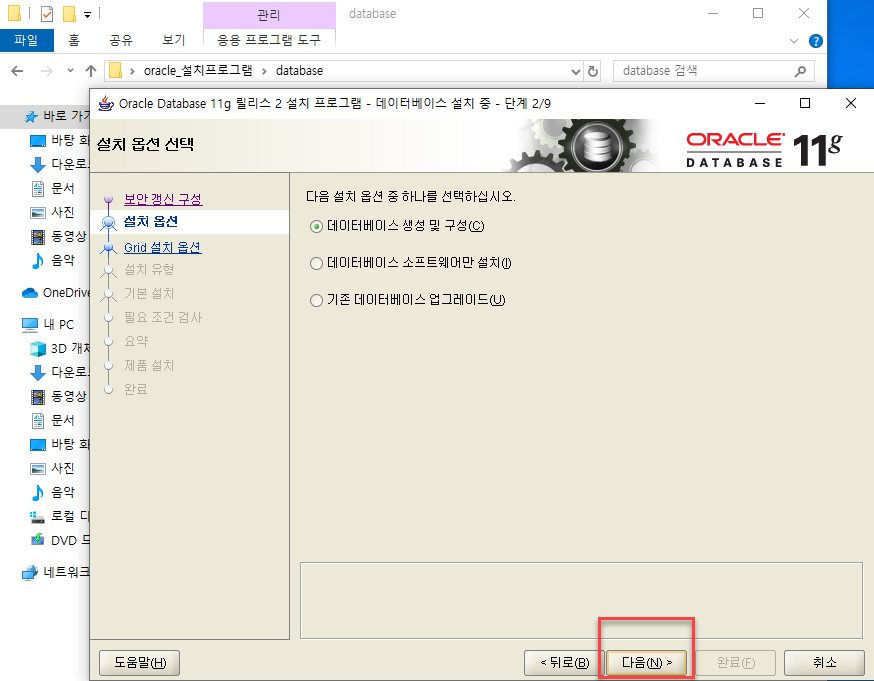 데이타베이스 생성 및 구성(C)를 선택하고 다음
