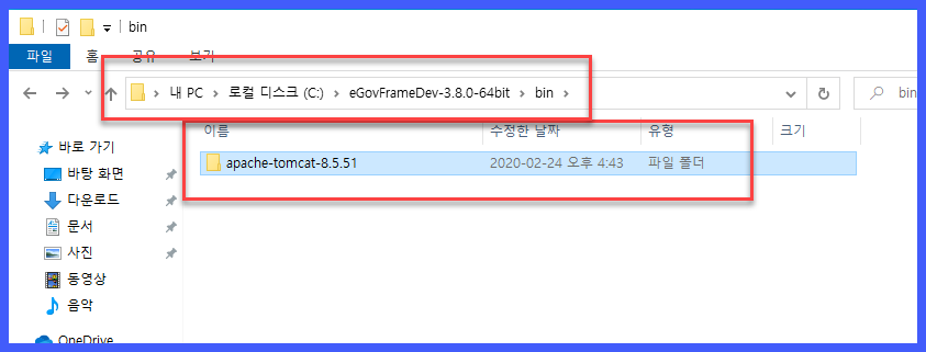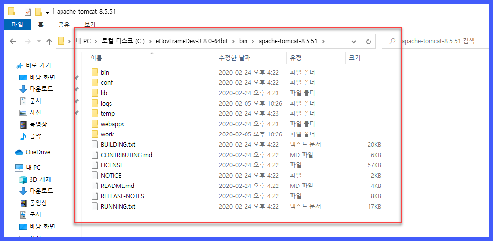 apache-tomcat-8.5.51\apache-tomcat-8.5.51\ 형태가 되지 않도록 주의한다. 톰캣 압축을 풀어서 보면 apache-tomcat-8.5.51\apache-tomcat-8.5.51 형태이므로 종종 실수할 때가 있다.
