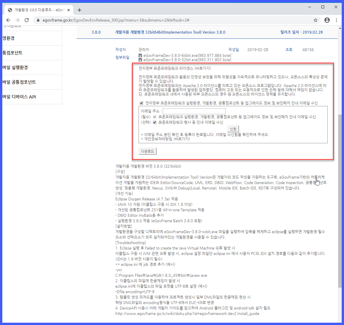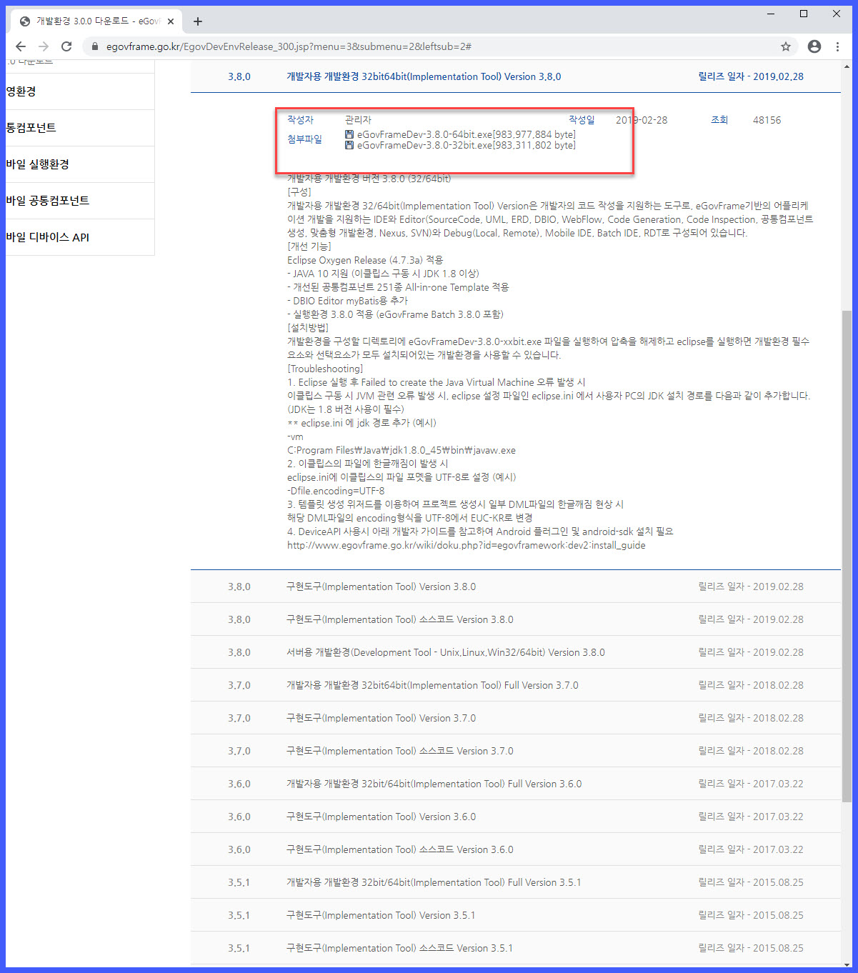 4. 3.8개발자용 개발환경 32bit64bit(Implementation Tool) Version 3.8.0릴리즈 일자 - 2019.02.28 클릭