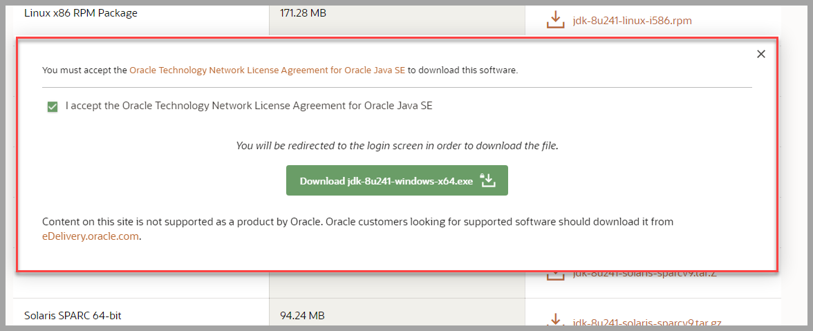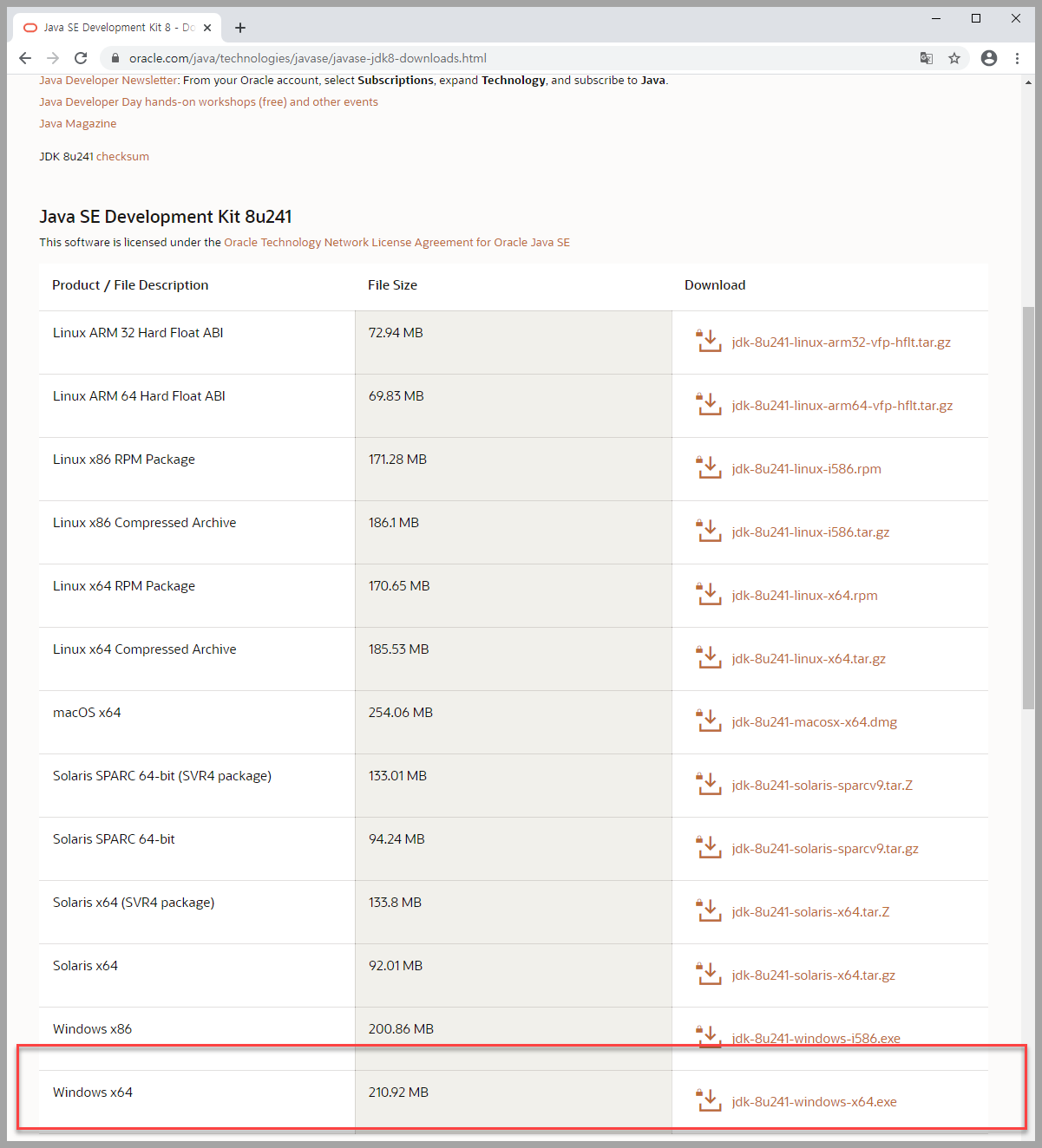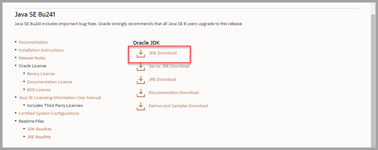 4. jdk 1.8 을 설치할 예정이므로 Java SE 8u241 영역으로 이동하여 JDK Download 클릭