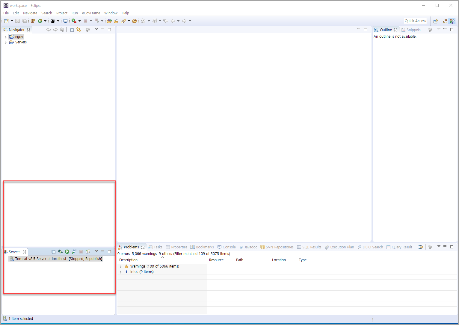 - Project Explorer 과 Data source Explorer 는 닫아놓는다.