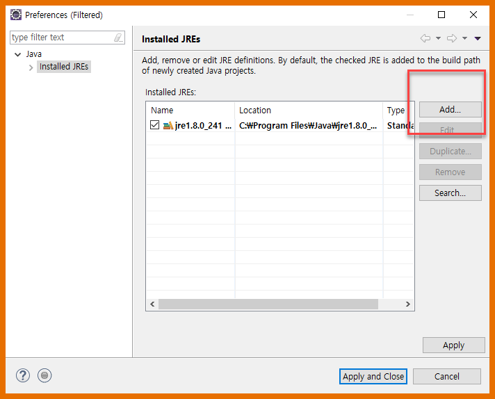 - Installed JREs 화면에서 기존 설치된 것만 보인다.