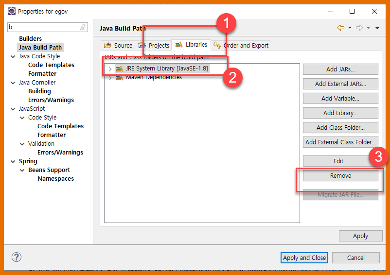 - Libraries 탭을 클릭하여 JRE System Library[JavaSE-1.8]을 지워준다.