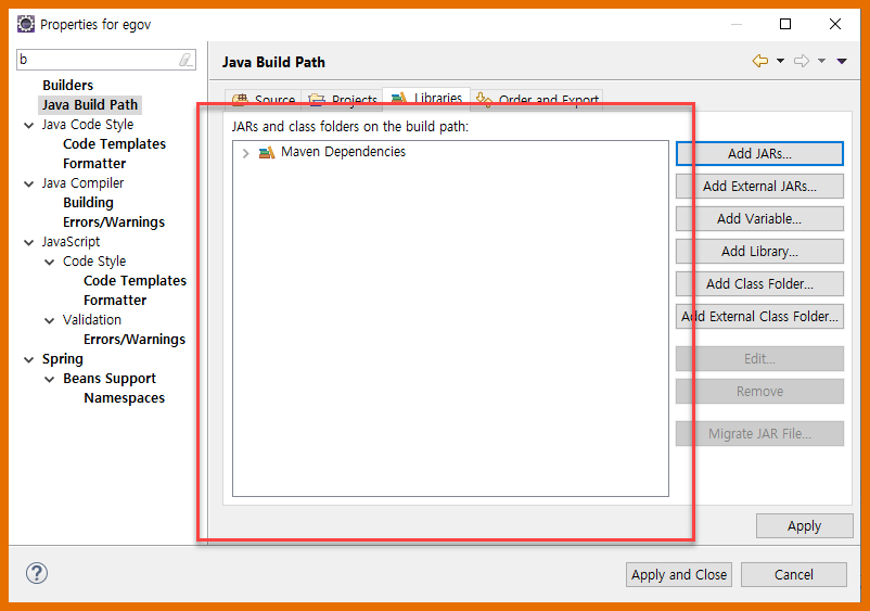- input box에 b 라고 입력을 하면 Java Build Path 가 보인다.