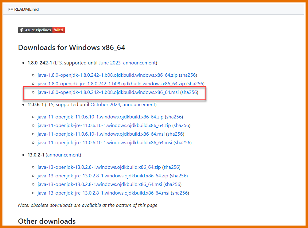 - 받고자 하는 것이 OpenJDK1.8 이므로 java-1.8.0-openjdk-1.8.0.242-1.b08.ojdkbuild.windows.x86_64.msi 를 클릭하여 다운받는다.