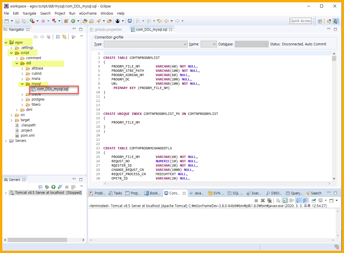 프로젝트(egov) > script > ddl > mysql > com_DDL_mysql.sql 파일을 더블클릭해서 열어본다.