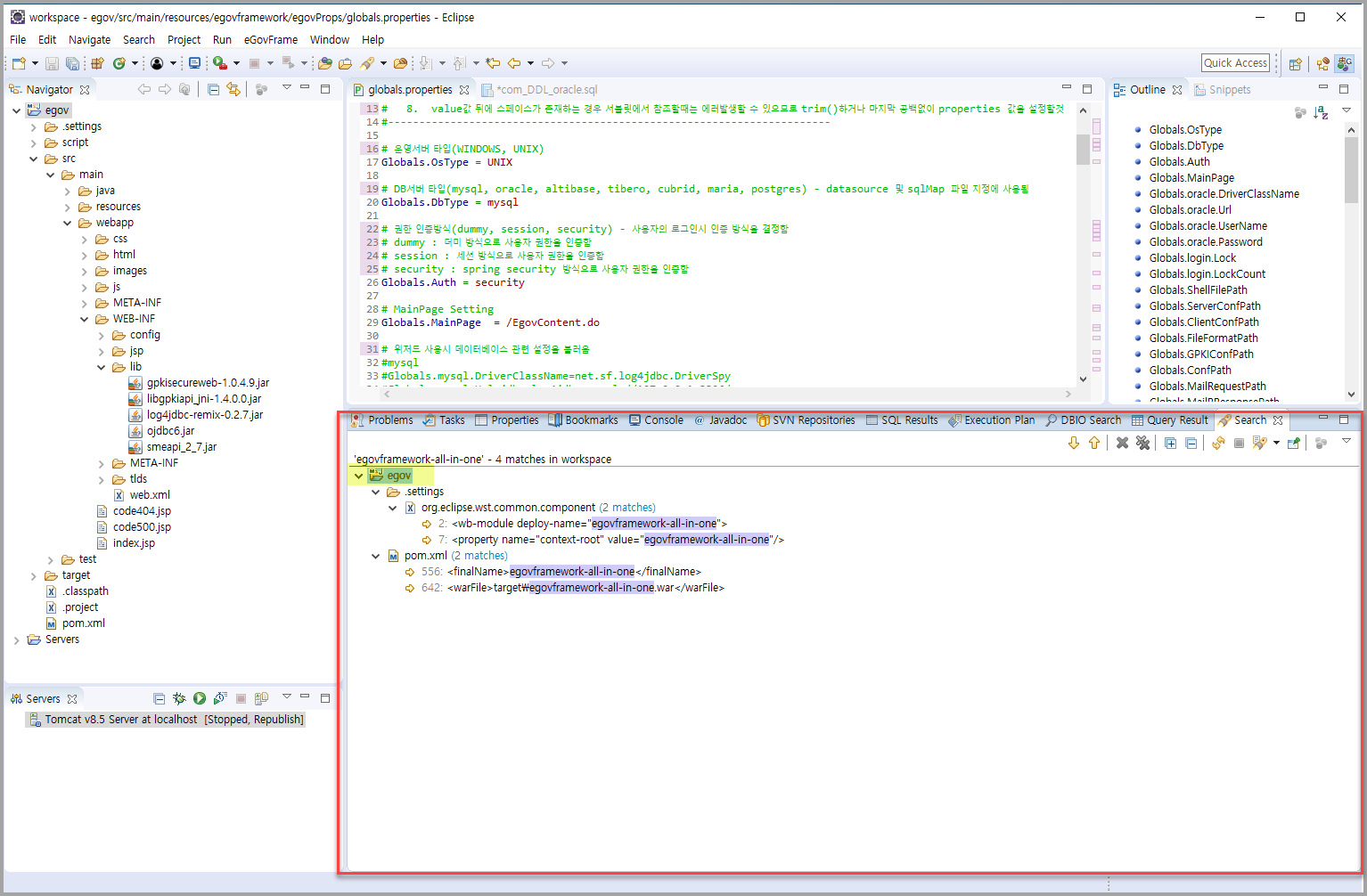 - 프로젝트 생성시 Common All-in-one 을 선택하게 되면 프로젝트의 이름 정보가 egovframework-all-in-one 으로 고정되어 있다. 이것을 검색해서 프로젝트 생성시 입력한 이름으로 바꿔준다.