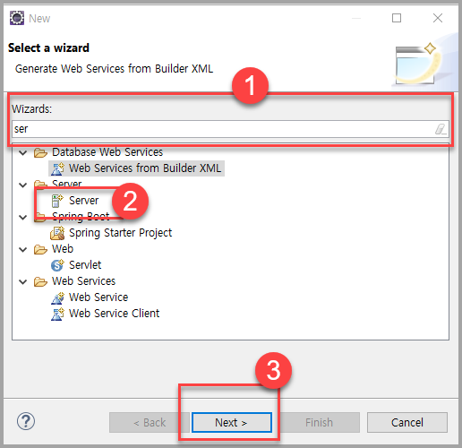 - Wizards: 부분에 ser 라고 입력하면 아래애 Server 가 나온다.
