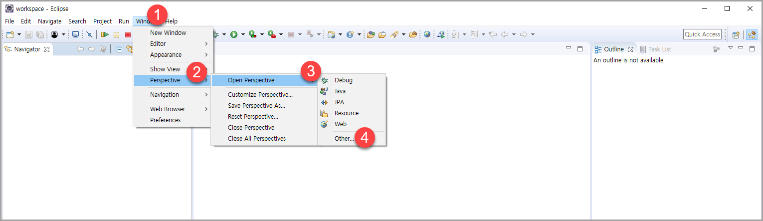 - Window > Perspective > Open Perspective > Other 를 클릭
