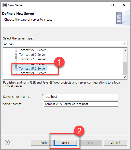 - Tomcat v8.5 Server 를 선택한 후에 Next