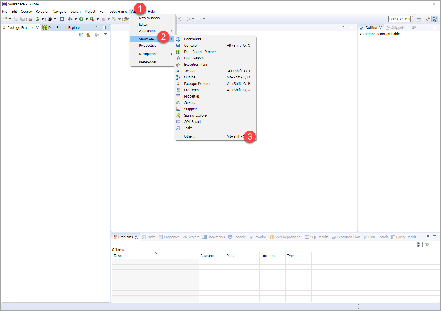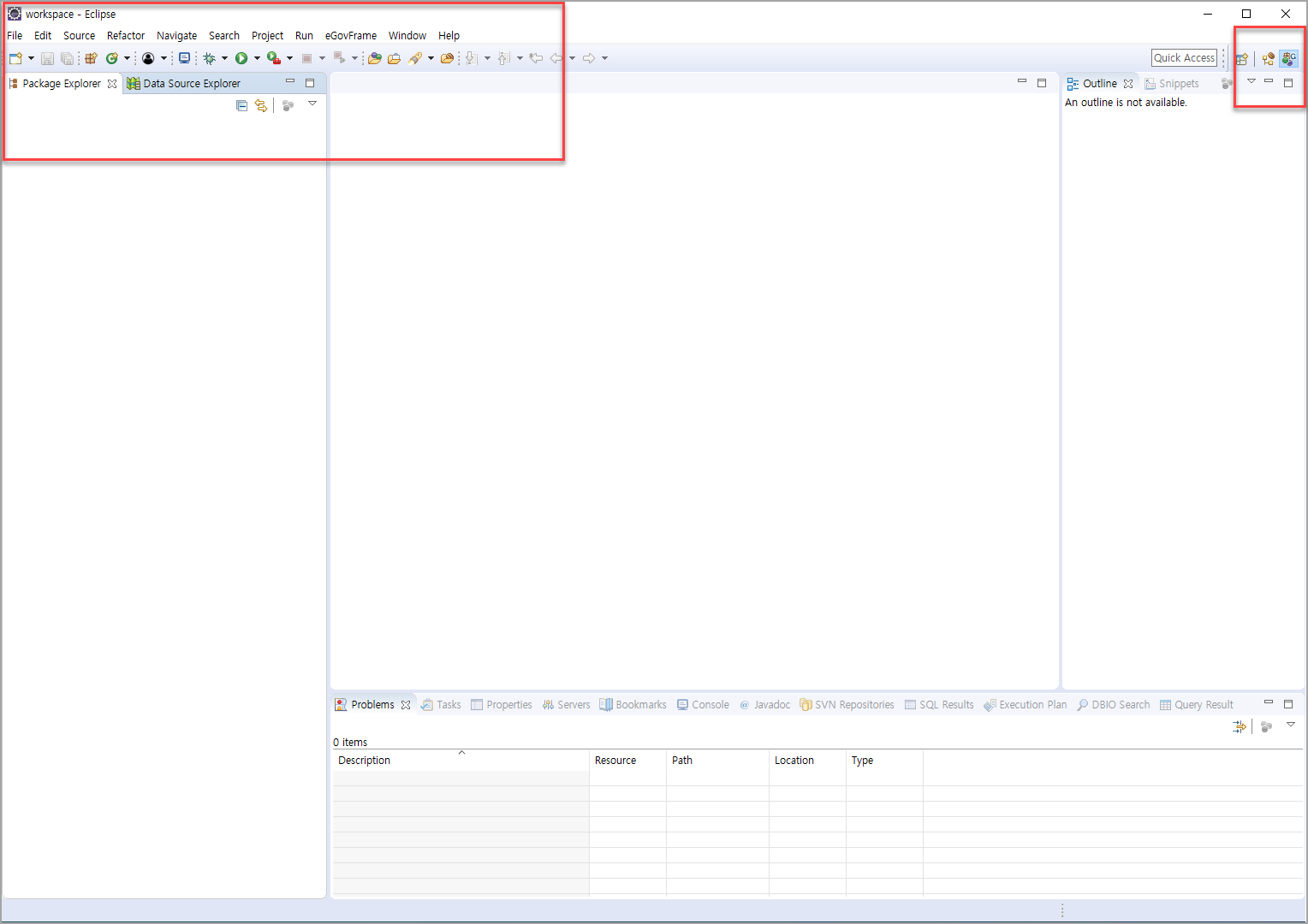 - Project Explorer 과 Data source Explorer 는 닫아놓는다.