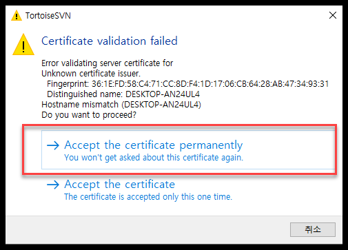- Accept the certificate permanently 를 클릭한다.
