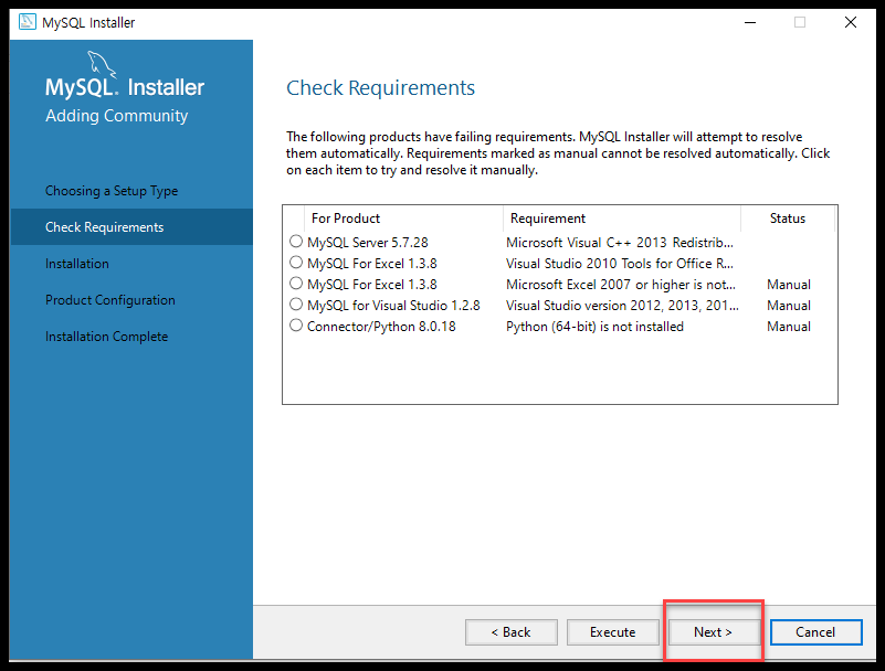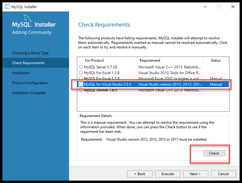 - Check Requirements 에서 아무생각 없이 다음을 클릭하여 넘어갈려고 하는데..