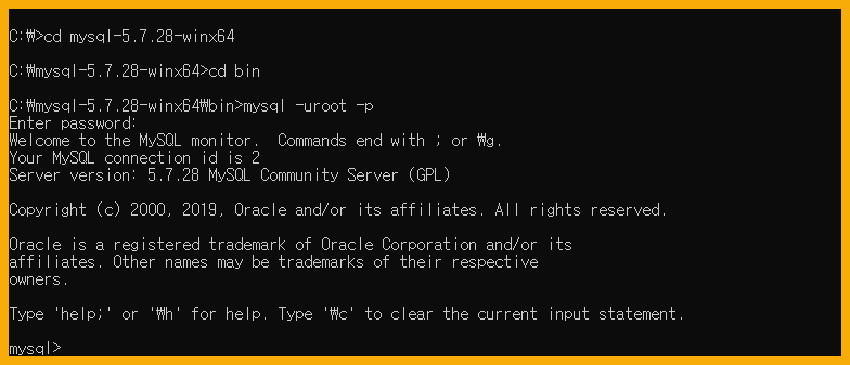 - c:\>cd C:\mysql-5.7.28-winx64\bin