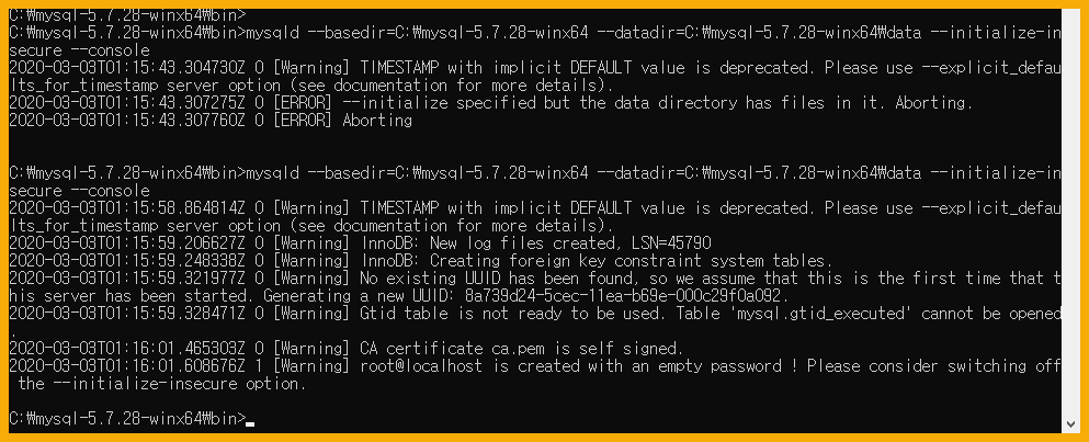 - C:\mysql-5.7.28-winx64\bin>mysqld --basedir=C:\mysql-5.7.28-winx64 --datadir=C:\mysql-5.7.28-winx64\data --initialize-insecure --console
