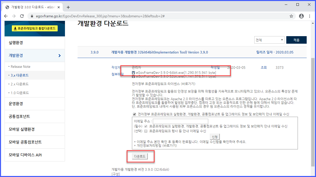 - eGovFrameDev-3.9.0-64bit.exe[1,290,915,941 byte] 를 클릭한다. 윈도우10 64비트 환경에서 작업할 예정이므로.