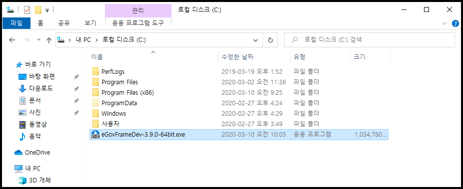 - 다운로드 받은 eGovFrameDev-3.9.0-64bit.exe 파일을 C:\로 이동시켜준다.