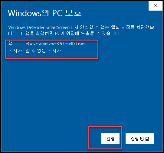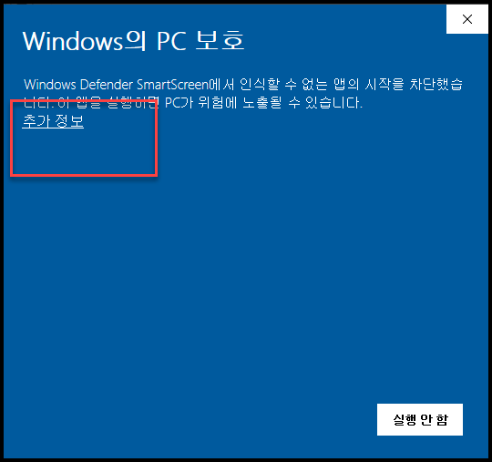 - 이전에는 나오지 않던 아래와 같은 화면이 나온다. 추가 정보를 확인하여 실행해준다.