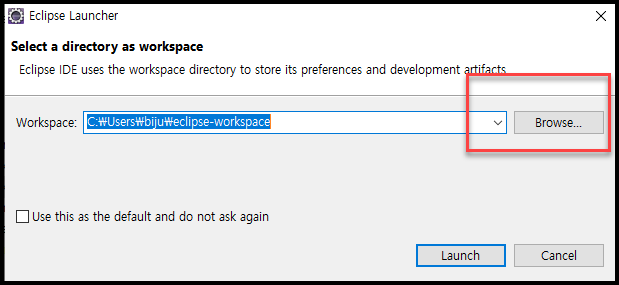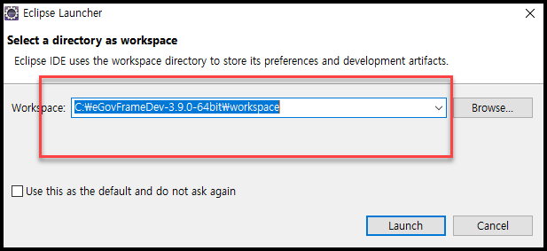 - Workspace경로를 잡아준다. C:\eGovFrameDev-3.9.0-64bit\workspace 로 잡아준다.