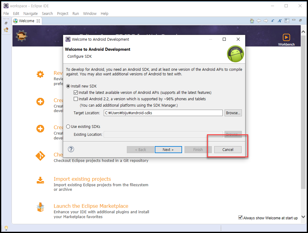 - 실행하자 오류가 발생한다. 그냥 무시하고 닫아준다. Android SDK는 지금 사용할 생각이 전혀 없다.