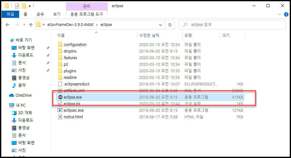 - C:\eGovFrameDev-3.9.0-64bit\eclipse 하위에 있는 eclipse.exe 를 실행한다.