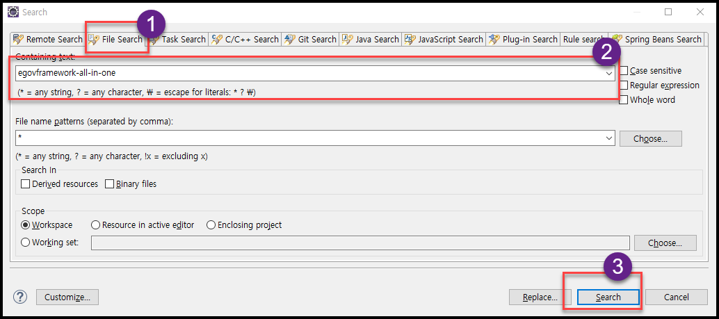 - 프로젝트 클릭 > Ctrl + h 를 눌러 검색창을 열고 File Search 탭을 클릭하여 containing text 부분에 egovframework-all-in-one 이라고 입력하고 Search 를 클릭한다.