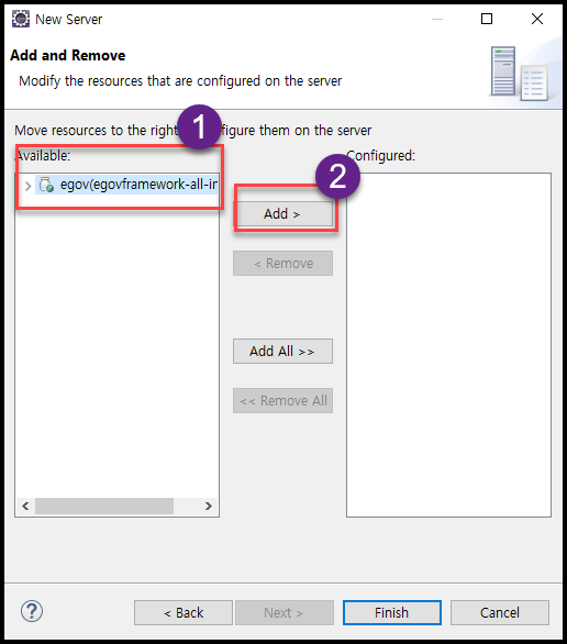 - 왼쪽 프로젝트를 선택해서 Add > 를 클릭하여 설치하는 톰캣에서 프로젝트가 돌아갈 수 있도록 한다.