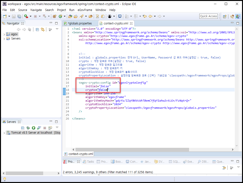 - 3개의 파일이 수정되었다. 수정된 파일은 다시 한번 정리하면 global.properties, context-crypto.xml, context-datasource.xml 이렇게 3개의 파일이다.
