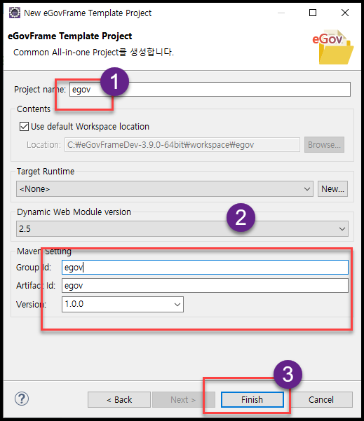 - Project name과 Group id를 입력해준다. 여기서는 egov 로 입력하였다.