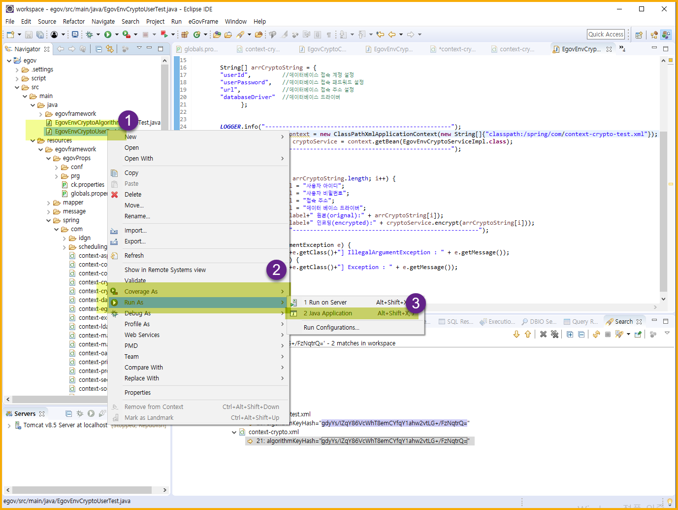 - EgovEnvCryptoAlgorithmCreateTest.java 파일을 선택하고 오른쪽 마우스 버튼을 클릭 > Run As > 2. Java Application 을 선택한다.