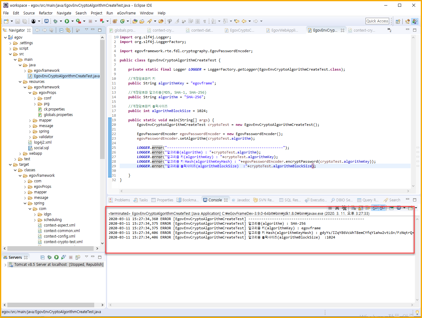 3. EgovEnvCryptoAlgorithmCreateTest.java 를 실행.