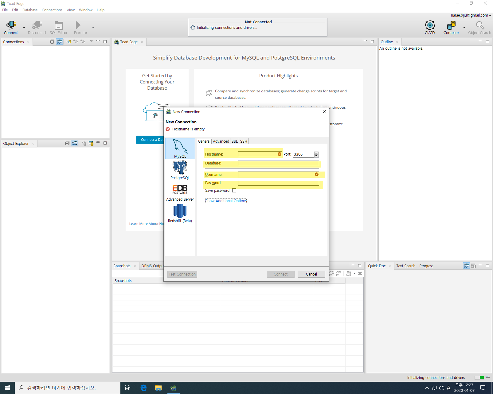 MySQL 클라이언트 프로그램으로 Toad Edge를 사용중