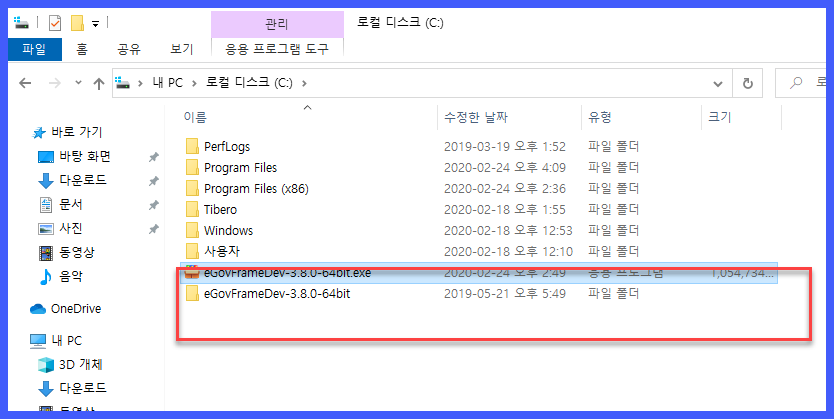 3. 다운받은 eGovFrameDev-3.8.0-64bit.exe 파일을 C:\ 로 옮겨서 더블클릭한다.