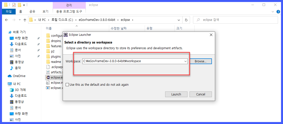 C:\eGovFrameDev-3.8.0-64bit\eclipse 폴더에 있는 eclipse.exe를 실행한다.